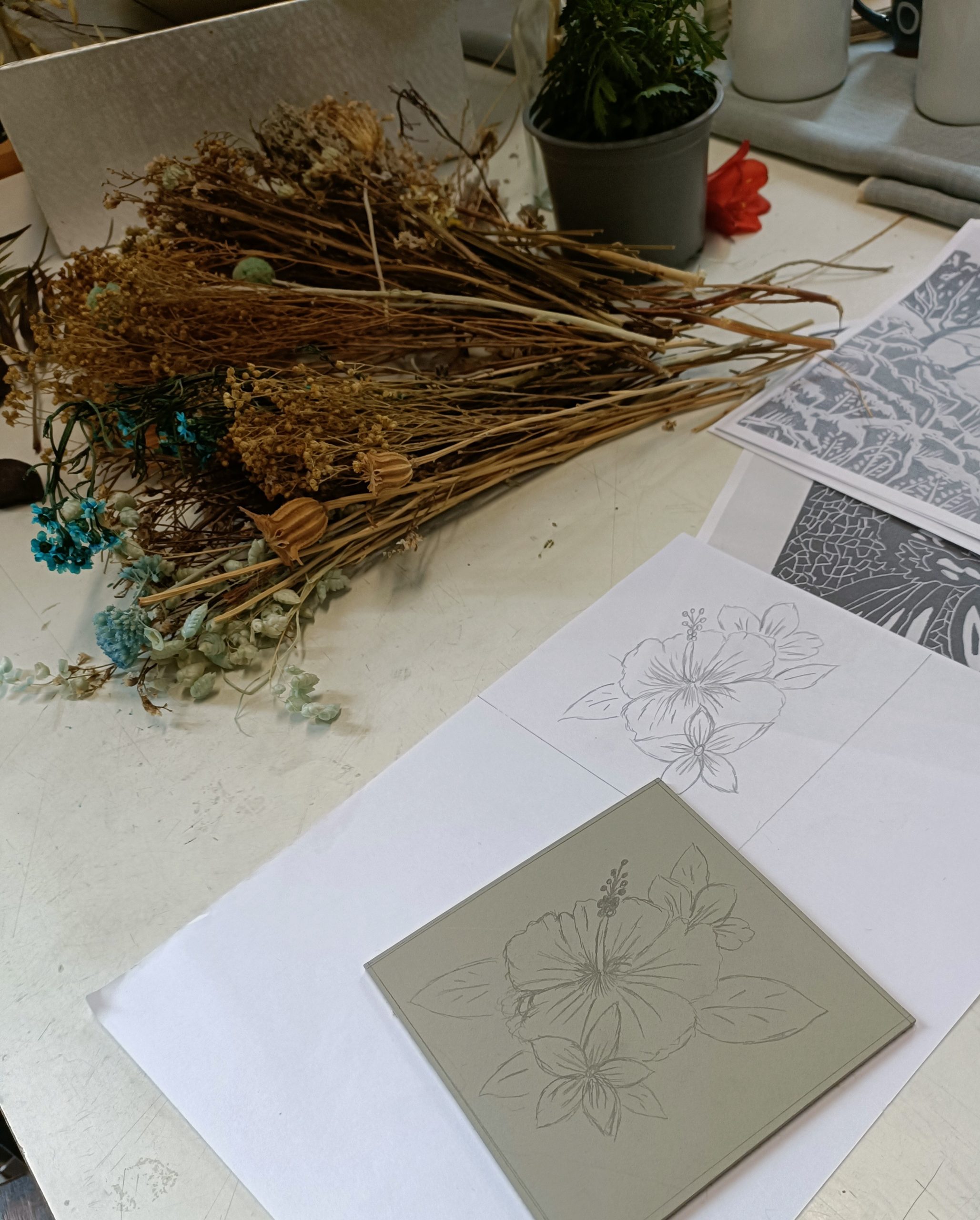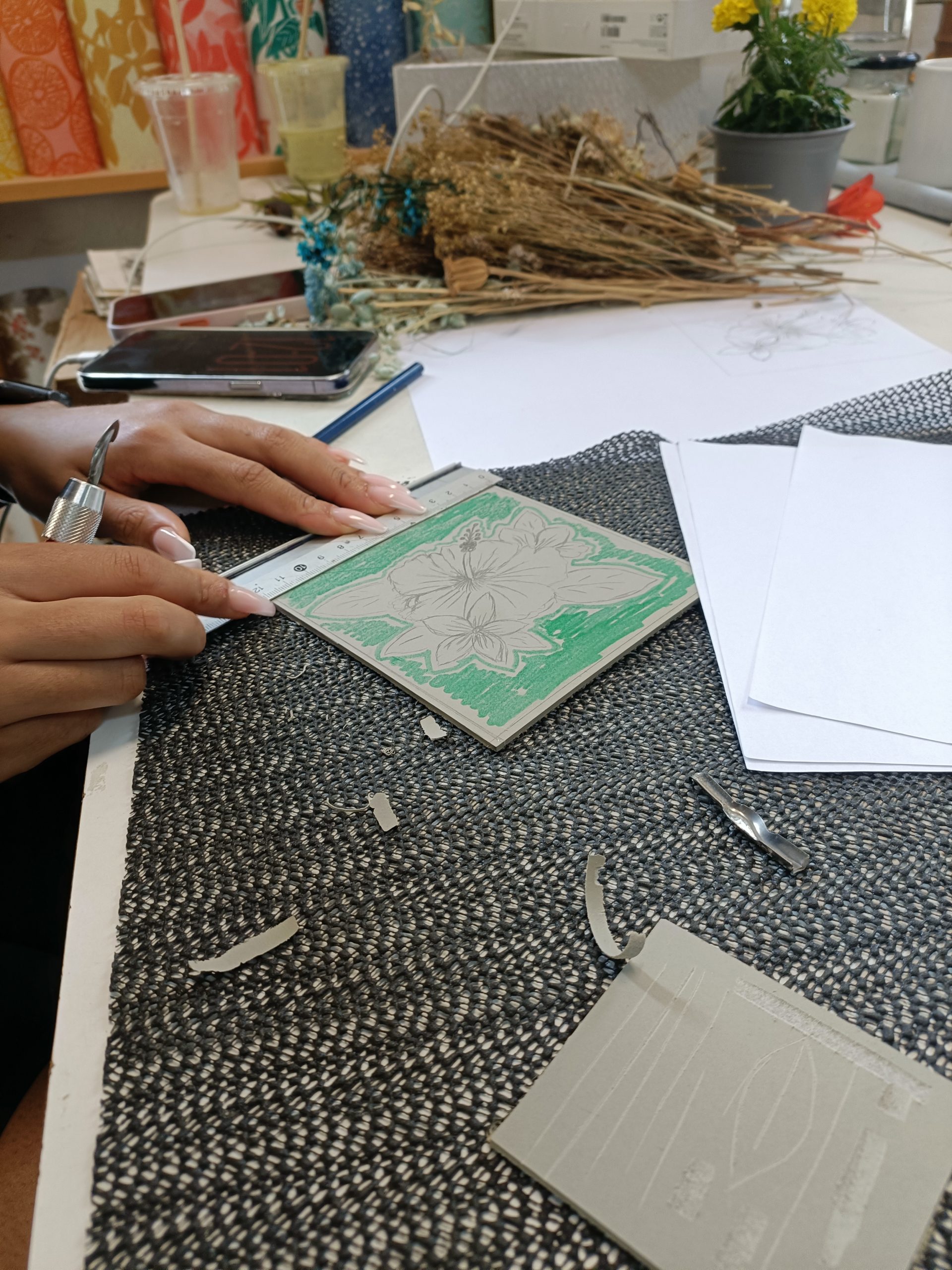 El linograbado permite desde líneas finas y delicadas hasta grandes manchas de color. En el taller encontrarás diseños, motivos botánicos y referencias visuales para ayudarte, pero si tienes una idea propia, te animamos a traer tus referentes para personalizarlos: