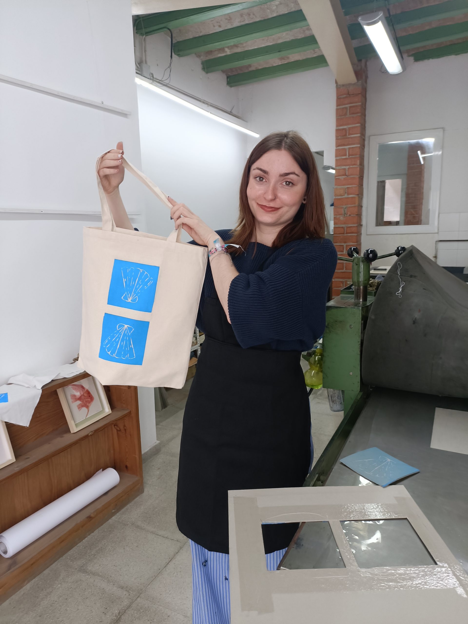 Aprende el arte de la talla en linóleo para estampar tu propio diseño en una Tote Bag de algodón utilizando el tórculo profesional, mientras disfrutas de un rico desayuno.